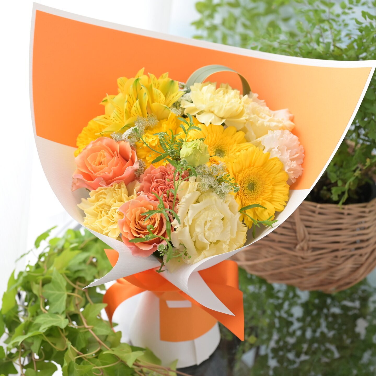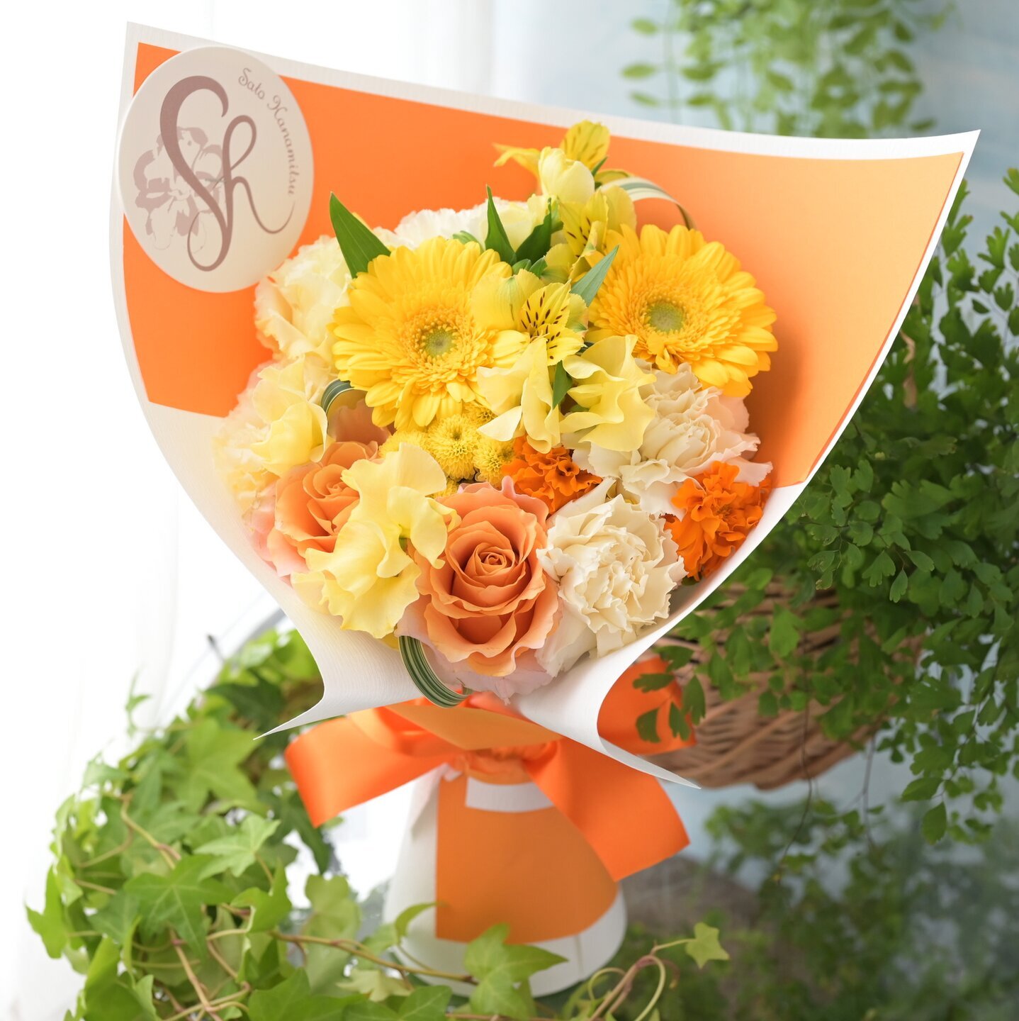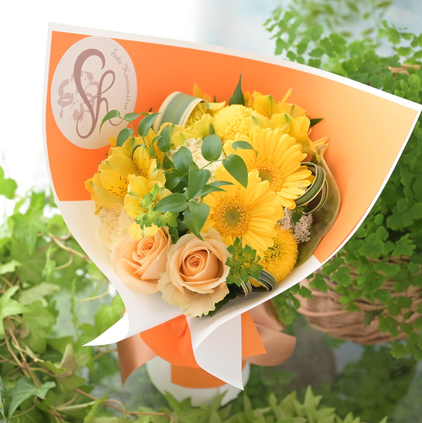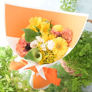 基本この商品はオレンジラッピングペーパーで「かわいい男の子用」というイメージでおつくり致します(※写真のお花は過去におつくりした商品ですので、あくまでもイメージでお考え下さい)