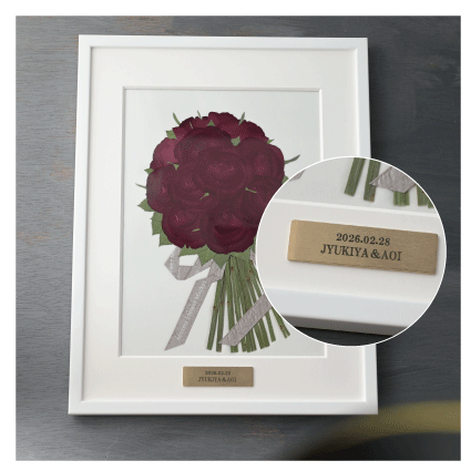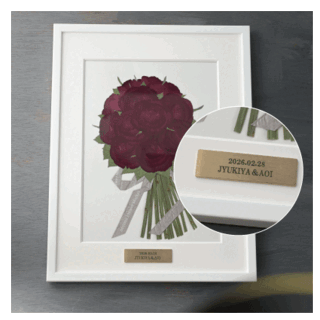 お二人の名前(アルファベット)と記念の日付が真鍮のプレートに印刻してアフターブーケにつけれます。(注文カート内のメッセージカード入力欄にお二人の名前(アルファベット)と記念の日付 例)JYUKIYA AOI 2026.2.28) を入力ください。名前日付以外は印刻できません。