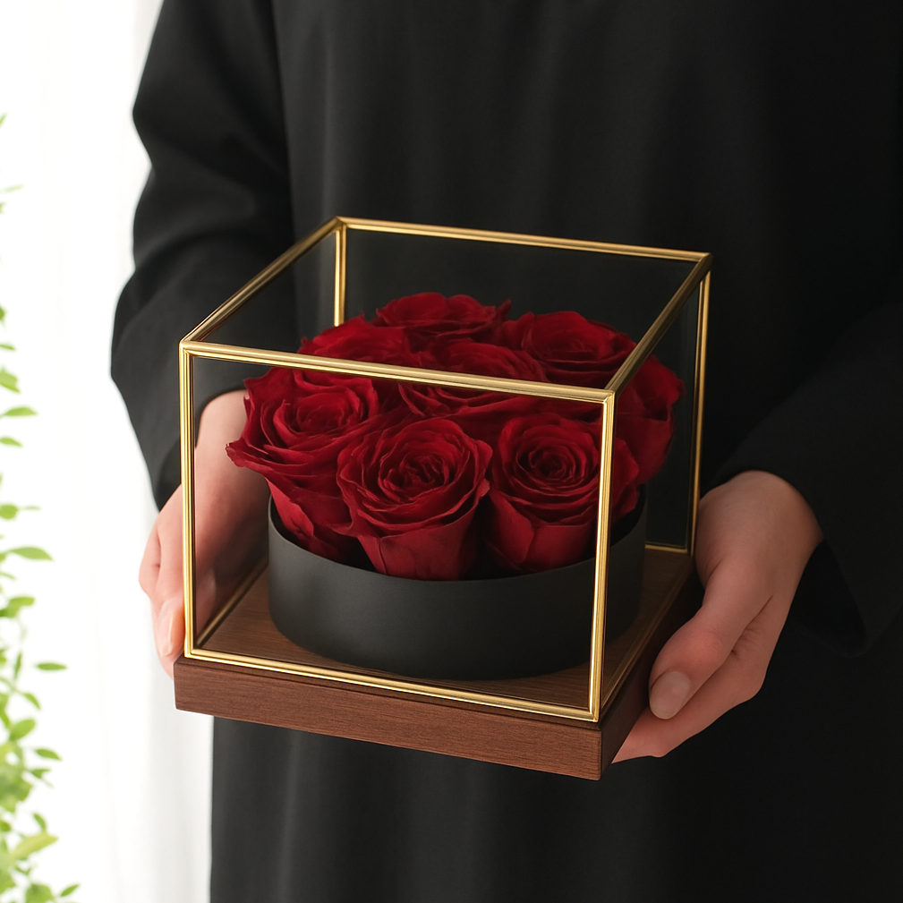 大切な思い出の赤いバラの花をそのままプリザーブドフラワーににして、永遠の美しさと思い出に残すことができる「グラスBOX in 10ローズ」