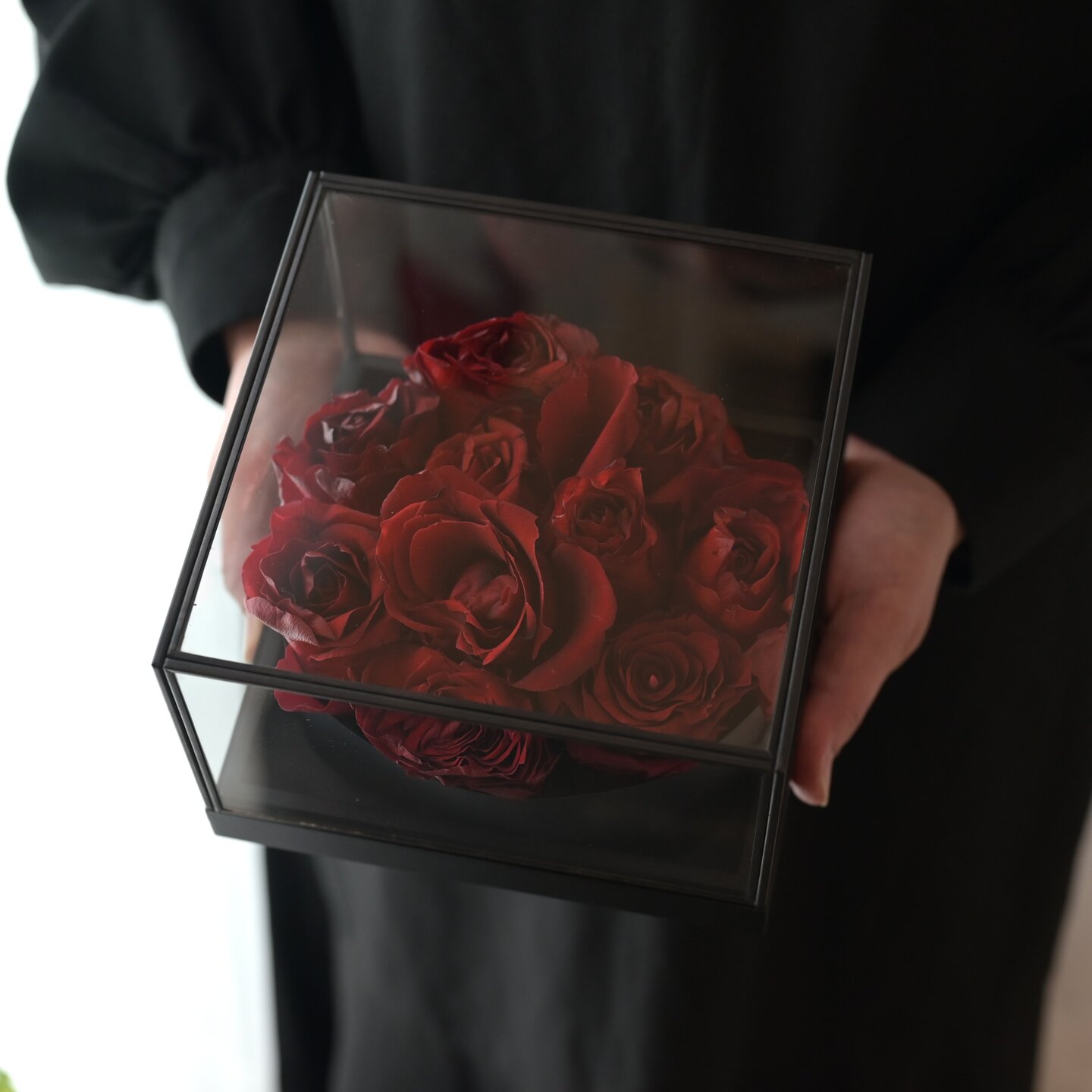 ガラスで覆われたクリアなBOXの中に10輪の赤いバラ(バラが大きい場合は10輪入らず8~9輪になる場合もあります)をアレンジし、素敵に仕上げます。