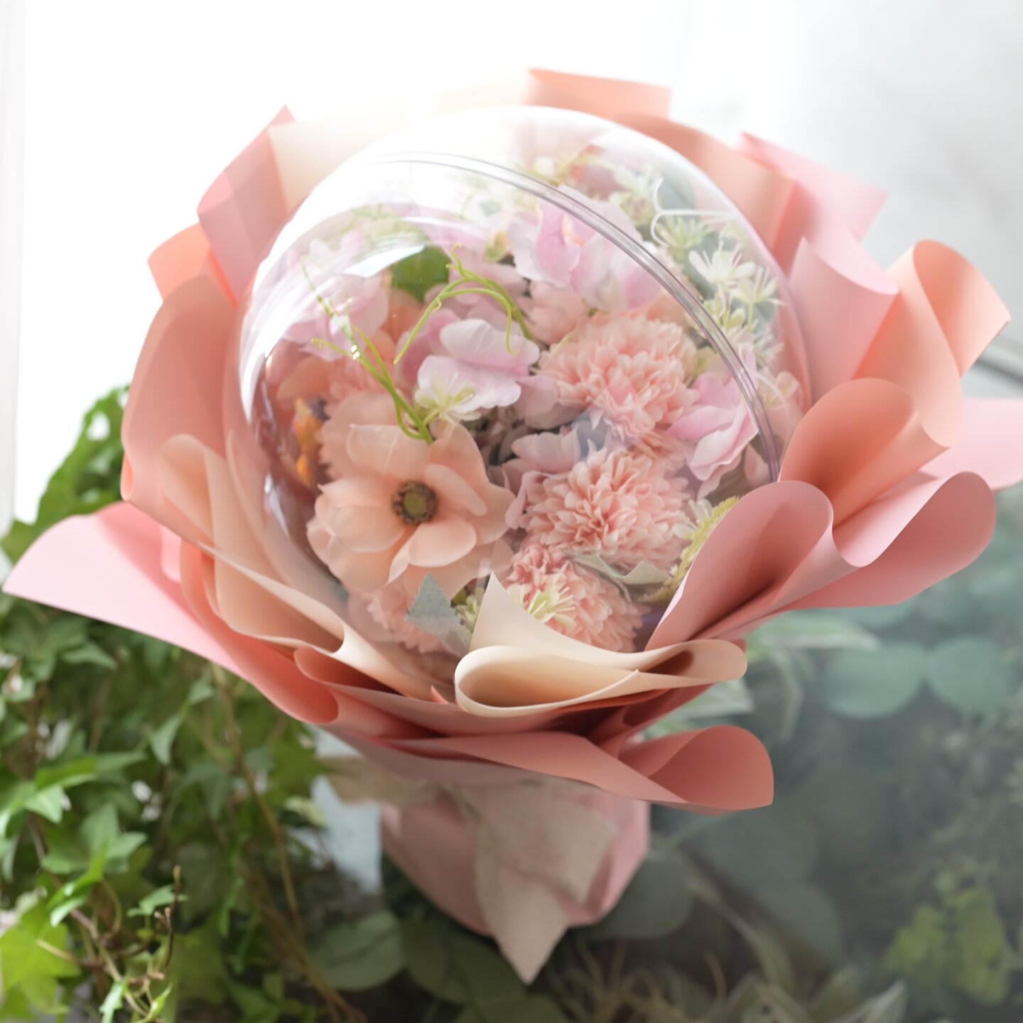球体のカプセルの中にお花をとじこめて、ふわふわのペーパーでラッピングしました。お花ははなみつの商品では珍しいアーティフィシャルフラワー(造花)を使用しているのでお手入れいらず。