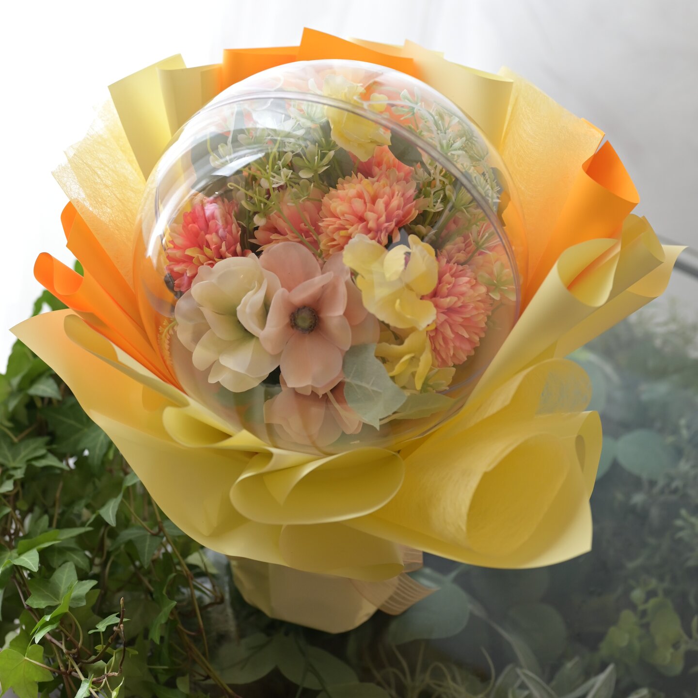 球体のカプセルの中にお花をとじこめて、ふわふわのペーパーでラッピングしました。お花ははなみつの商品では珍しいアーティフィシャルフラワー(造花)を使用しているのでお手入れいらず。