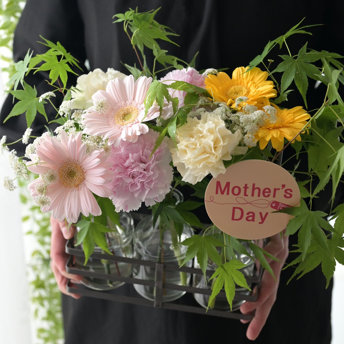 アイアンの籠の中に3本のガラスの花瓶が入ったセンスのいい器にピンク系でまとめたかわいいアレンジメントに仕上げたこの母の日ギフト。