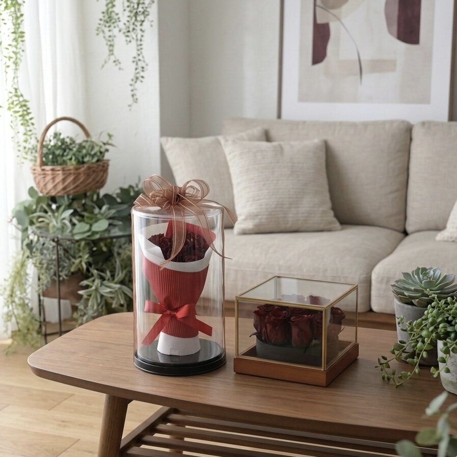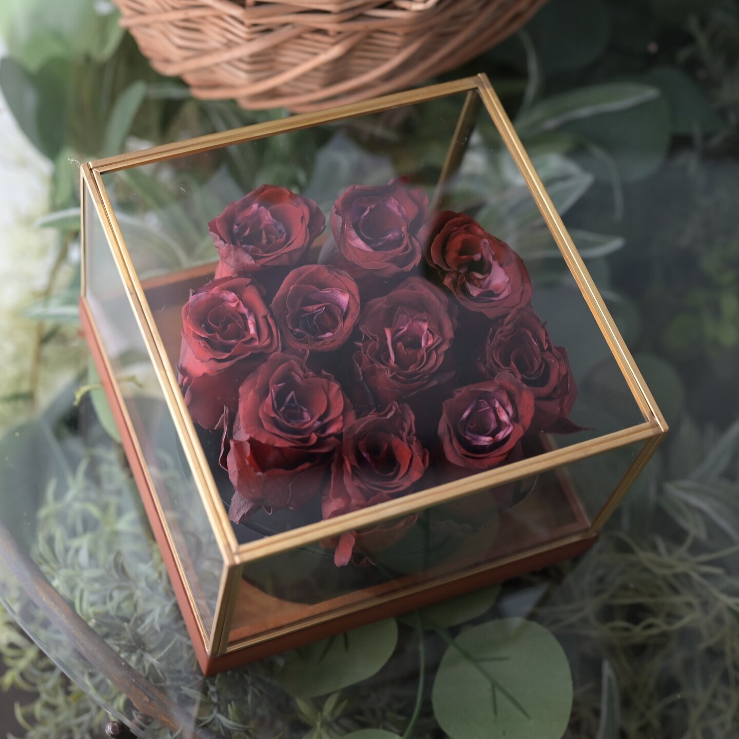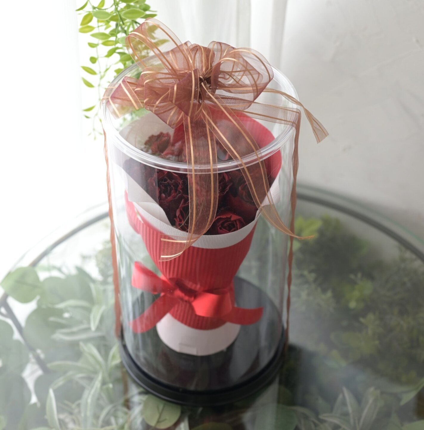 大切な思い出の赤いバラの花をそのままプリザーブドフラワーににして、永遠の美しさと思い出に残すことができる「ミニチュアブーケ12」+クリアBOX10ローズのセットをおつくりしました(セットでお申し込みだと21%以上お得です。